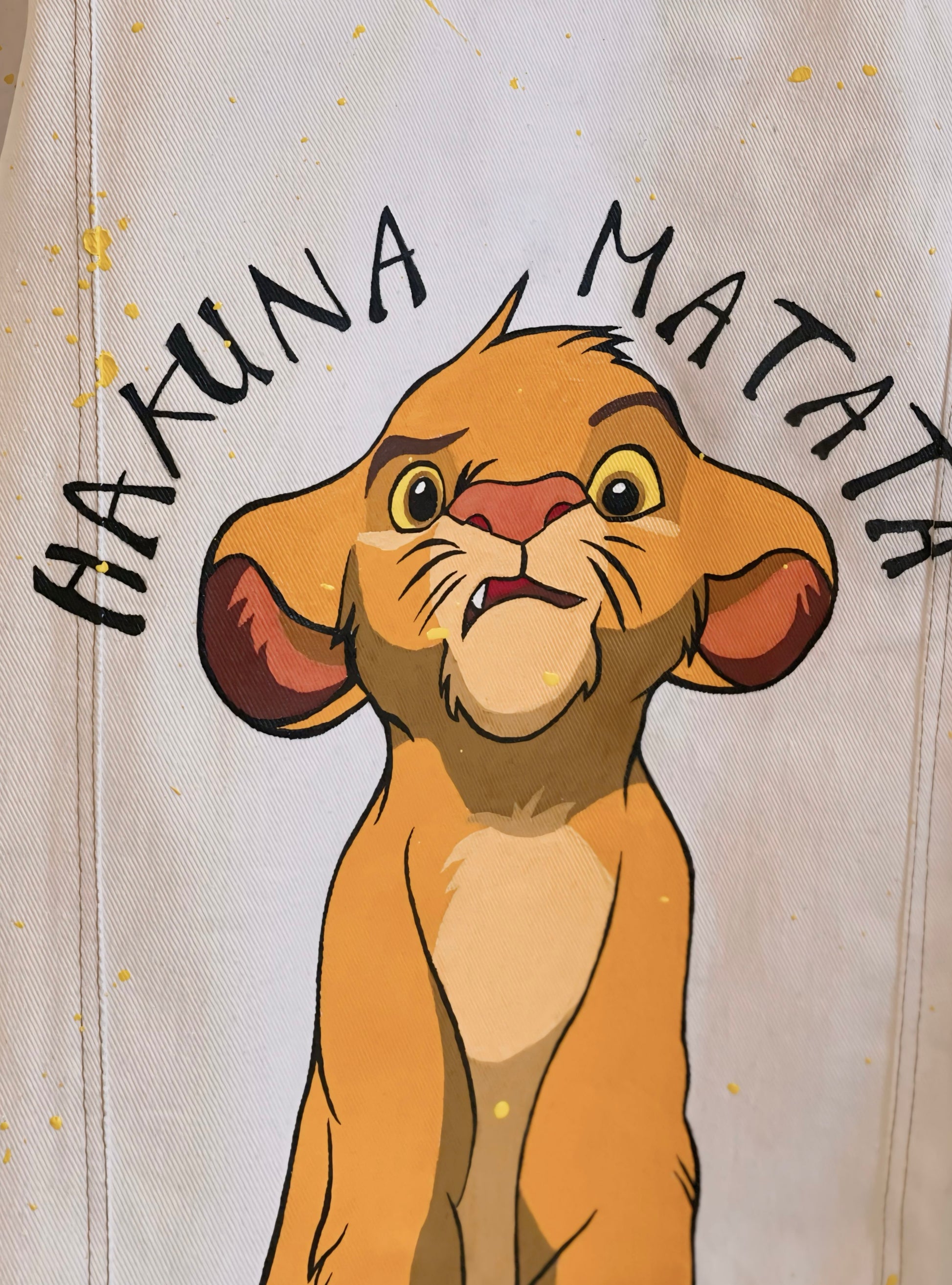 The DARBAS SIMBAS LEGACY JACKET is a stylish and unique white jean jacket that features four hand-painted Simbas characters. It is customized just for you, allowing you to express your individual style .