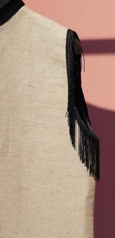 Introducing the TAAJI cream chicks vest, a unique blend of bulap and velvet fabric. This vest features moving chicks that add a playful touch to your outfit. The shoulder design adds an extra element of style to this must-have piece. Upgrade your wardrobe with TAJI.